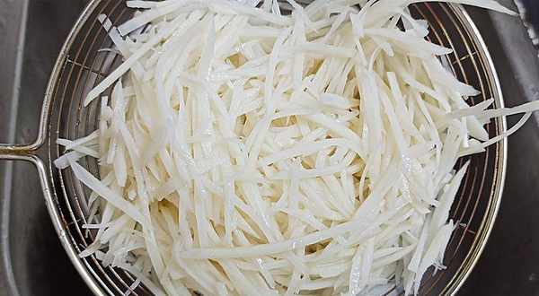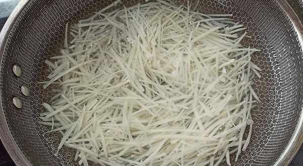 【步骤三】:锅中添上清水大火烧开,放入1植物油和1勺白醋,把藕丝清洗几遍,然后倒入锅中,大火焯水1分钟。