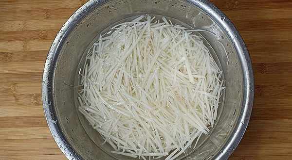 【步骤一】:把莲藕去皮,先改刀切成薄片,再改刀切成丝放入大碗中,用清水泡上防止发黑。