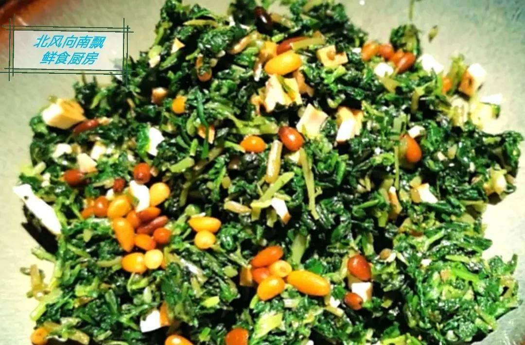 2 加入松仁,花生米,加盐,鸡精,生抽,香油各一勺,拌匀即可,美味可口,春季时蔬菜。