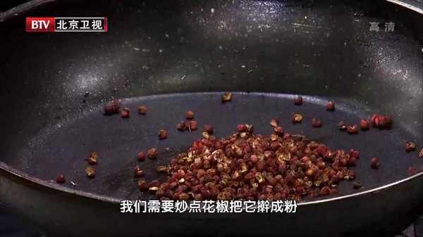 ①干锅加热不放油,把花椒粒放进去,小火煸炒2分钟左右,炒到花椒粒能用手轻轻碾碎的程度,盛出来,用擀面杖撵成花椒粉备用。