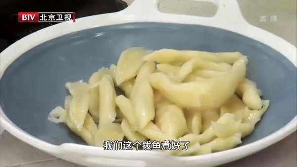 ③和一团面(用开水烫面),装在碗里,准备一支筷子,筷子上面蘸点油,用筷子在碗边一推、一锯,一条面鱼就出来了。面鱼煮熟后捞出备用。