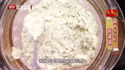 ③把菠菜面糊平铺在蒸锅中浸湿的笼布上,薄厚均匀,盖上锅盖大火蒸8分钟左右。