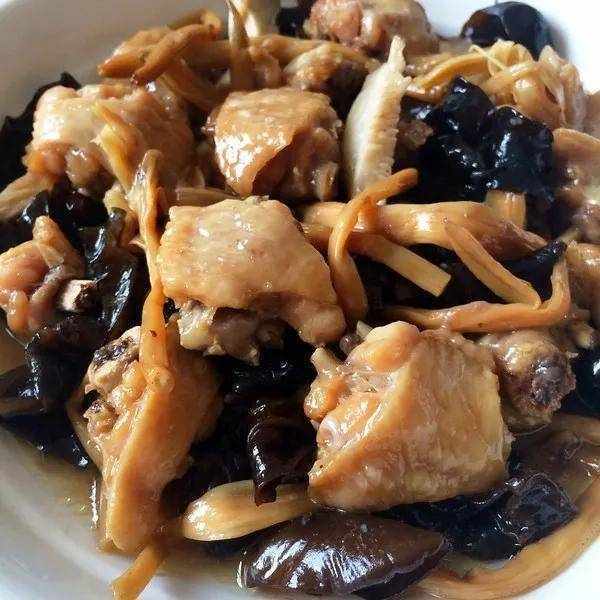 6,把黑木耳和黄花菜洗干净,沥干水分后把黑木耳和黄花菜也加入鸡块中,再切4片姜片和几个大蒜一起放入鸡块中,搅拌均匀,一起腌制20分钟。