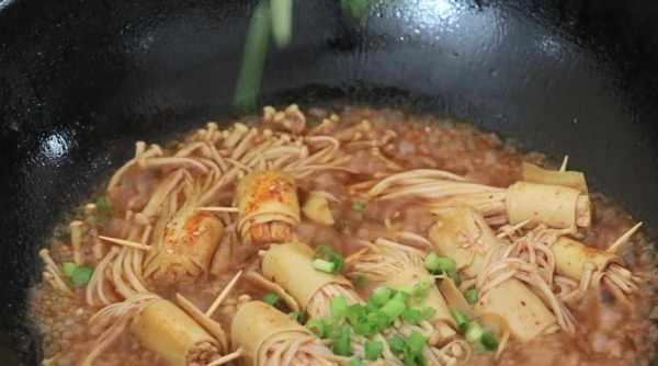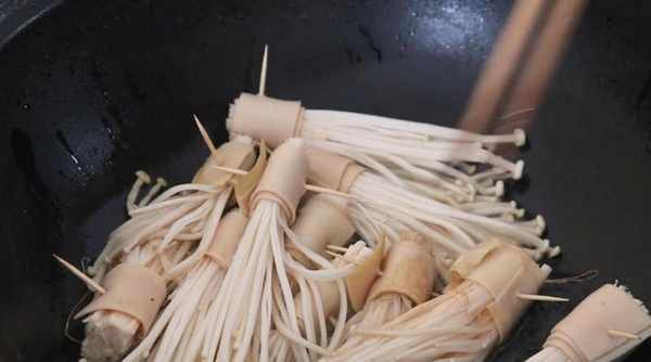 8.金针菇这样做,非常的入味,经过煎制后,豆腐皮的口感也更加好,总之是看起来诱人,吃起来开胃下饭。喜欢的朋友赶快试试看吧,保管家中的老人和孩子都喜欢!