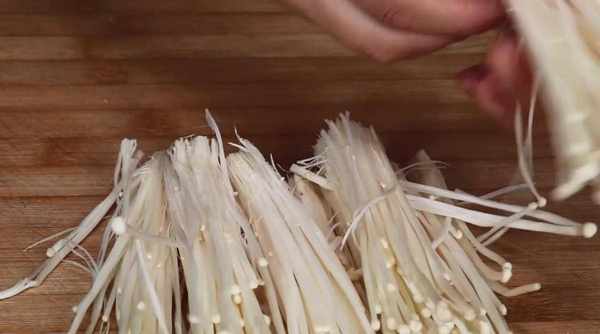 2.准备一把新鲜的金针菇,不要立刻清洗,先用菜刀将金针菇的根部给切掉1厘米宽,然后,将金针菇放在食盐水中清洗一下。清洗干净控干水之后,用手将它给分成小簇的,掰好后放在案板上备用。