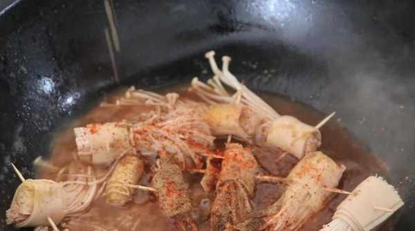 【基本材料】金针菇,豆腐皮,牙签,葱,淀粉,食用油,生抽,食盐,白糖,陈醋,辣椒面,孜然粉,白芝麻