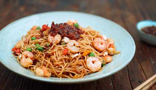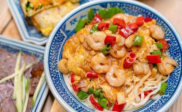 食材:大虾、桃园建民牛肉耗辣椒、大葱、面条、酱油、胡椒粉、蚝油、醋、盐