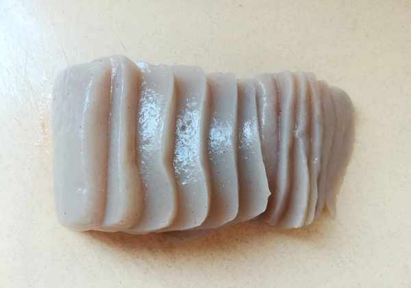 魔芋豆腐清洗干净切成薄片,不要切太小块。