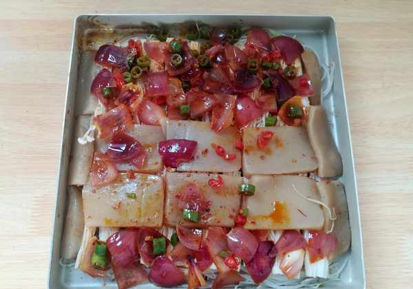 把焯过水的金针菇和豆芽放到烤盘里,上面放上煮熟的魔芋豆腐和洋葱、辣椒等配菜。