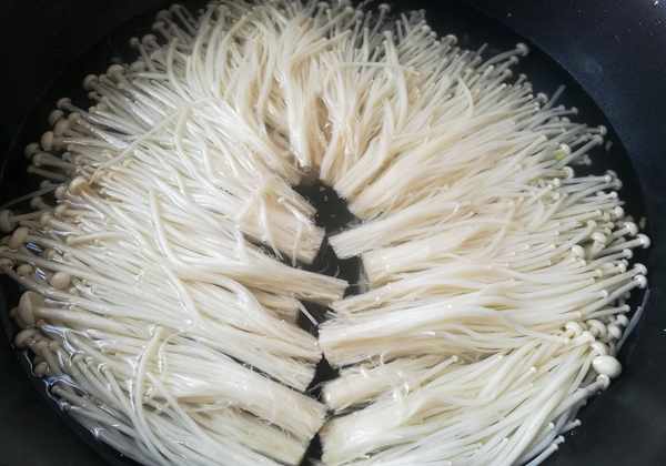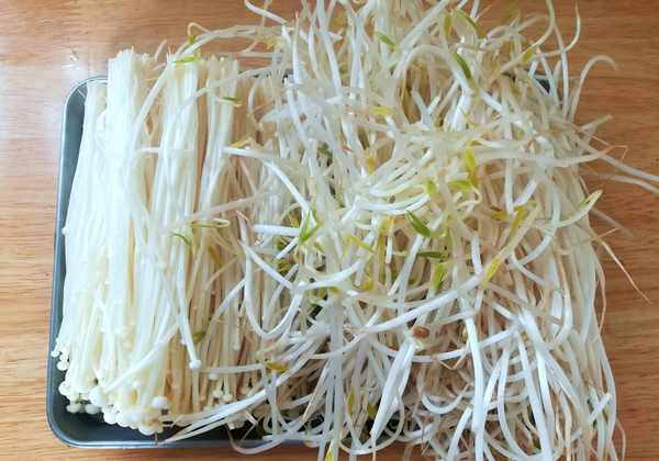 烧一锅热开水,放入金针菇焯水煮3分钟,捞出来沥干水分。就着同一锅水,把豆芽放进去焯水大约1分钟捞出来。