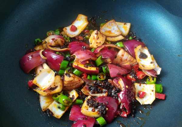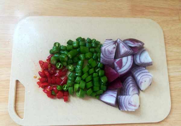 洋葱切成小块,青椒切成圆圈,小米椒切成圆圈。