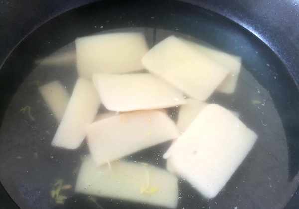 把魔芋豆腐放入开水里,煮大约2分钟,这样可以去掉魔芋豆腐中的碱味。