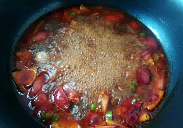 热锅放火锅底料翻炒到融化,放入洋葱和辣椒翻炒出香味。