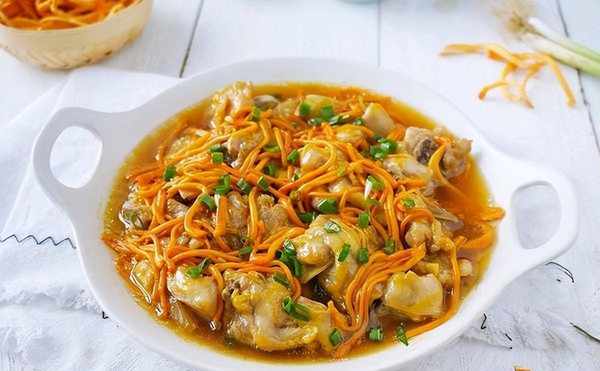 做法:1用热水泡把虫草花泡软,备用。