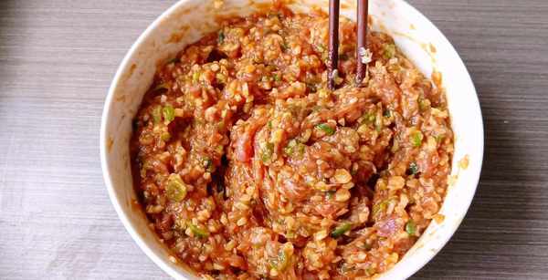 3,往肉馅中加点葱姜水,搅拌上劲。打入一颗鸡蛋,加点盐、白糖、13香、生抽、老抽,倒入姜末和葱花搅拌均匀。再倒入莲藕碎拌匀就可以了。