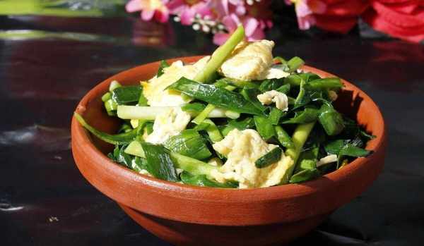 到了下午要做饭的时,我妈也没有回,于是,我和我媳妇准备接手,她摘洗蔬菜,准备好之后,我来下厨房炒菜,当天的菜肴有一道同今天话题关联性很强的韭菜花炒鸡蛋。
