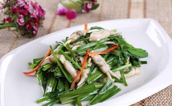 锅中放油,微微加热之后,放入姜丝爆香之后放入我们刚刚准备好的蛏子肉,开始翻炒均匀,放入少许食盐调味,最后放入韭菜段,翻炒至断生后即可出锅。