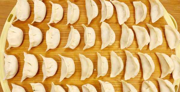 3、把提前和好的饺子面取出来,先揉一会,把它分成小块,然后摁压一下擀成圆圆的饺子皮,把搅拌好的饺子馅放入饺子皮内,包成元宝形状的饺子就可以。
