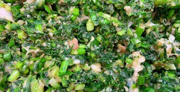 2、荠菜吃起来没有什么味道,我们可以加入适量的韭菜来增香,不喜欢吃韭菜味道的也可以不放。把挖回来的新鲜荠菜择一下,再用清水多淘洗几遍,然后把它剁碎,攥干水分放入肉馅内,接着再把少许的韭菜清洗干净,也切碎放入肉馅内,放入适量的盐、2勺玉米油朝一个方向搅拌入味即可。