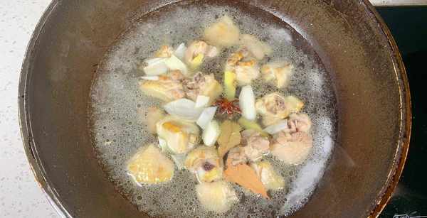 5、锅中加入80℃的温水然后再加入适量的盐,(加温水可以使鸡肉更快的炖烂而且也不容易发柴。如果加入冷水的话,鸡肉会瞬间收缩变紧,炖出的鸡肉不仅发柴还不容易炖烂)少许的老抽调个色,然后用铲子把它们搅拌均匀。盖上锅盖开小火炖制20分钟就可以了,出锅前撒上一把切好的葱花。翻炒几下就可以出锅了。