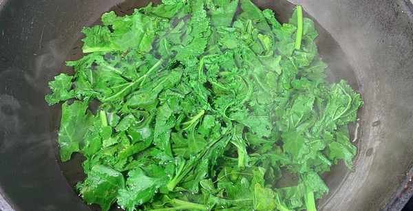 2、炒锅中加水烧开,放入一点盐,将洗好的芥菜叶子倒入水中,芥菜叶子表面带有刺毛且含有辣味,用热水焯一下能加以改善,为了使焯水后的芥菜叶子看起来更加嫩绿,在水中滴一滴食用油,芥菜叶子焯水时间不易过长,防止破坏维生素,将焯好水的芥菜叶子放入凉水中过凉捞出。