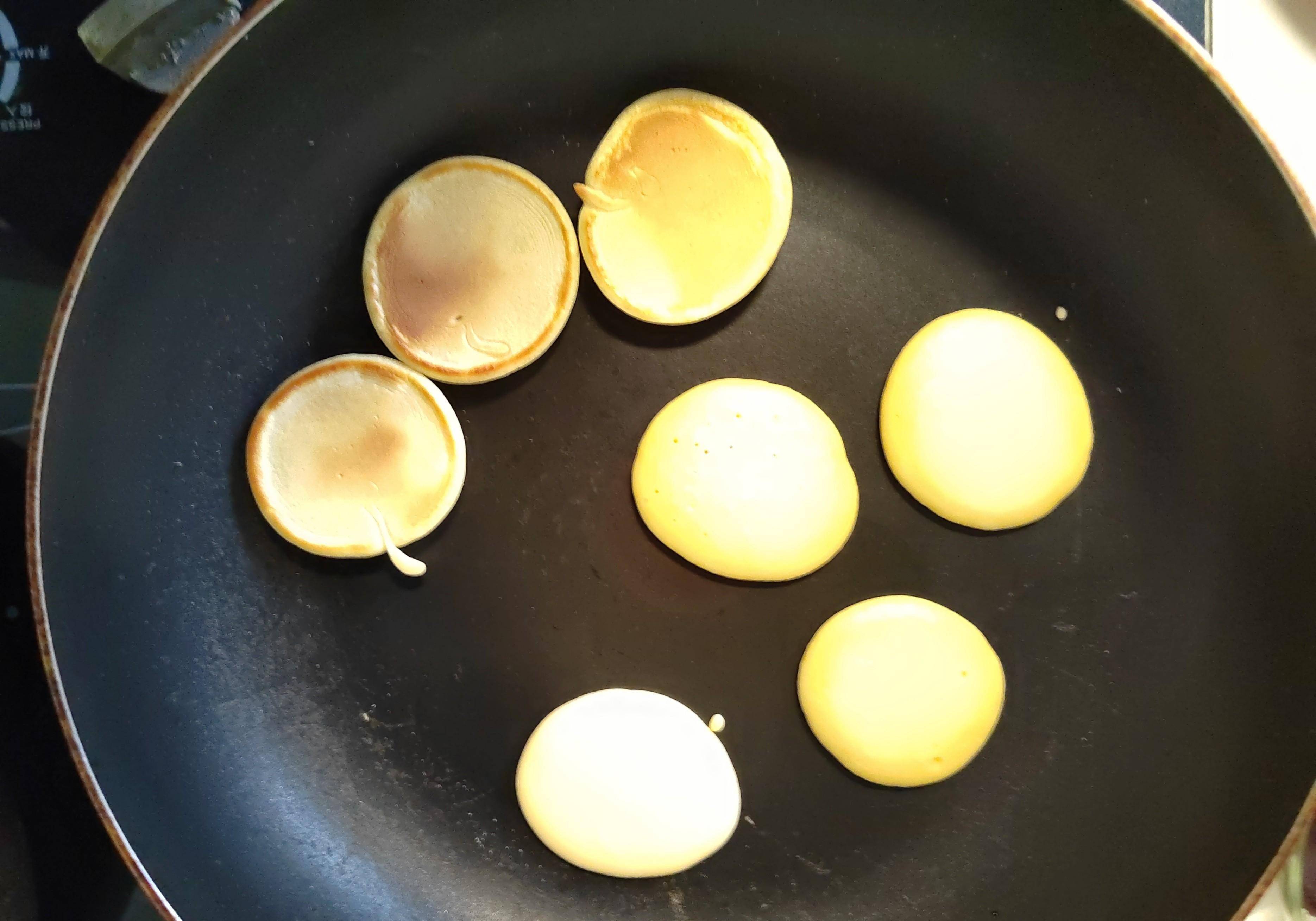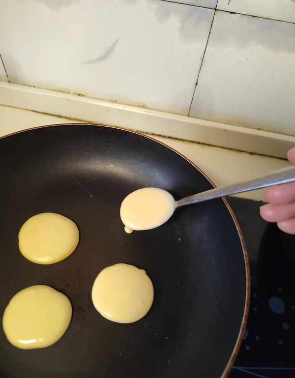 4、用勺子舀起面糊,从中心自然落下,面糊自然形成圆形。