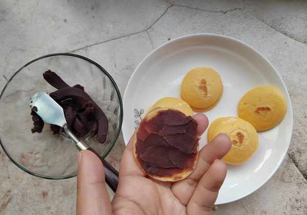 6、将煎好的松饼按照大小码好,同样大小的夹上豆沙馅料(推荐水性豆沙),抹平夹好即可。