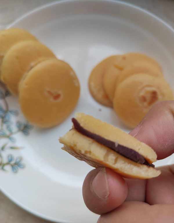 7、没有打发鸡蛋和放泡打粉的铜锣烧口感略有一点韧性,但是不硬哦,我觉得刚刚好。咬一口太香啦~
