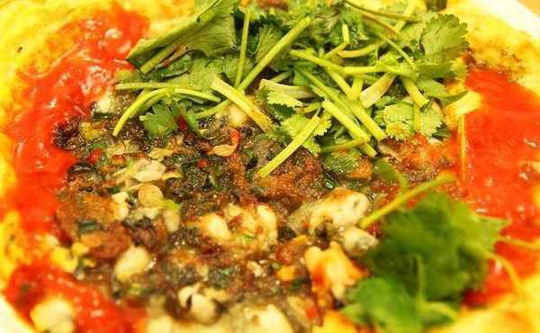2、平锅置小火上,下花生油烧八成热时将海蛎浆下锅,摊平,煎一会儿,