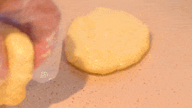 3.带上一次性手套,取适量玉米面团,压成圆饼,平底锅刷一点松茸油,放入玉米面饼