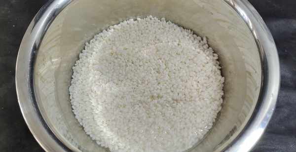 第一步:大米300克先用清水浸泡3个小时以上,再淘洗干净,直至用手可以轻松捏碎米粒的程度最好。