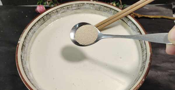 第三步:米浆倒出来后加入3克酵母粉搅拌均匀,面粉100克搅拌成很顺滑的面糊。再用保鲜膜覆盖,放置于温暖的地方发酵至两倍大。
