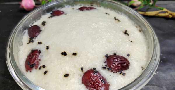 食材准备:大米300克,醪糟300克,面粉100克,耐高糖酵母5克,白糖60克,红枣碎适量,清水150克