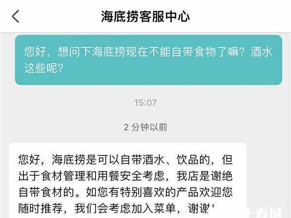记者随后也联系了海底捞客服中心,得到了同样的回复:海底捞是可以自带酒水、饮品的,但出于食材管理和用餐安全考虑,所有门店是谢绝自带食材的。如顾客有特别喜欢的产品,欢迎随时推荐,我们会考虑加入菜单。