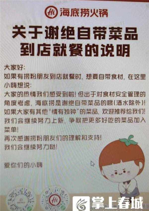 而也有消费者对此表示可以理解,在海底捞火锅(同德广场)就餐的莫亚宁说:“我觉得无所谓吧,你都去海底捞了,还要自带食材,这是为什么呢?如果你想自带食材的话,完全可以买火锅底料,在家自己做,出门吃火锅不就是图个方便嘛。”