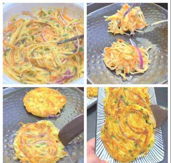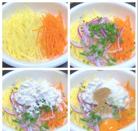 1、将土豆去皮切丝,胡萝卜和圆葱都切成丝,与土豆放入一个盆中。然后加入一大勺面粉和两个鸡蛋,然后放入少许葱花。
