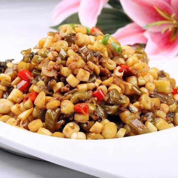 4,接着把桑叶牙尖也放进锅中,加入适量的食盐和花生油,搅拌均匀。加入少许花生油,可以使得桑叶牙尖一直保持青葱翠绿的颜色,绿油油的特别有食欲。