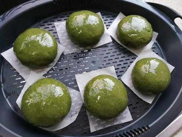 6,像包包子那样把自己喜欢的馅料放在面皮上,捏成圆球状后,蒸屉上放入油纸,把青团放在油纸上,保持大火蒸20分钟即可大功告成。