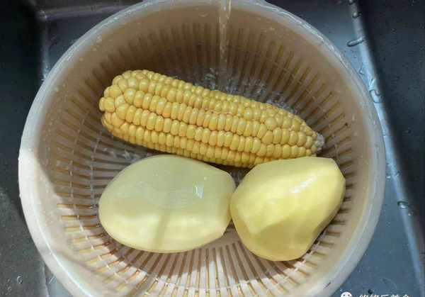 1.备好的玉米,还有土豆放在清水中洗干净。洗的时候,要把玉米处理一下,玉米洗净之后给它放在一旁。土豆洗净去皮,去皮后再冲洗一下。生姜洗净,切成片;