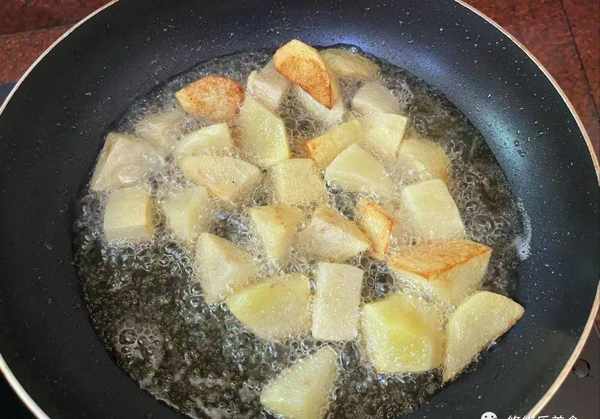 4.要想做出来的土豆金黄酥脆,我们可以先将土豆处理一下。放在锅中,用油煎一下,将锅里面的土豆煎至表面有点焦黄,然后盛出放在一旁;