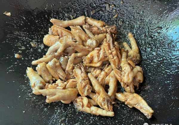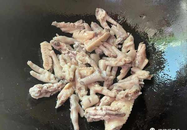 5.锅中加入油,将焯水后的鸡爪跟鸡翅倒入里面,用小火炒一下。食材下锅后,炒至表面有点微微焦;