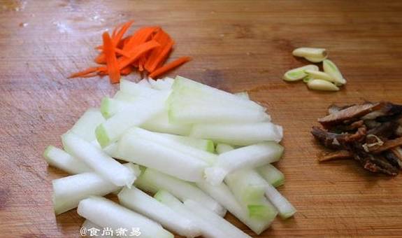 冬瓜去皮洗净,切成条,胡萝卜切丝、腊肉放进微波炉叮3分钟后取出,切丝,蒜瓣去皮切片