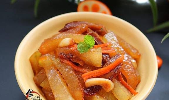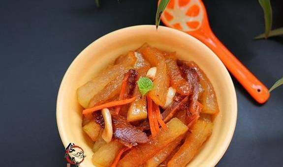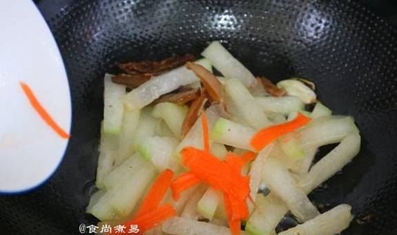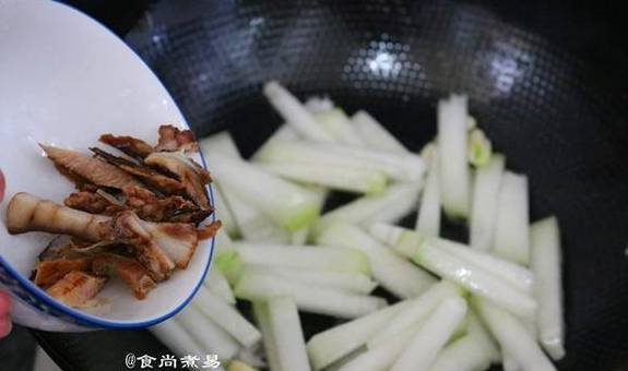 食尚小贴士:冬瓜切条容易熟,胡萝卜纯粹是调色作用。腊肉提前叮熟或在锅中蒸熟再切片,腊肉不能在锅中煸炒太久。