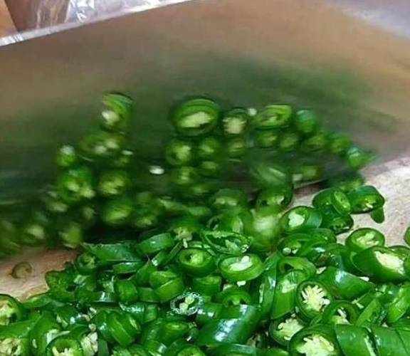 辣椒洗干净之后再控掉水分,或者是晒掉水分,表面上不能留有水分。再给切成圈。