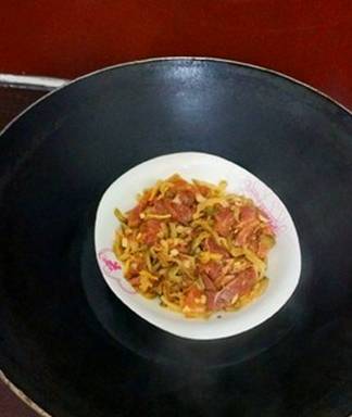 把腌好的肉放入榨菜,油搅拌均匀,大火蒸10分钟