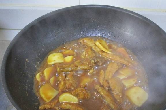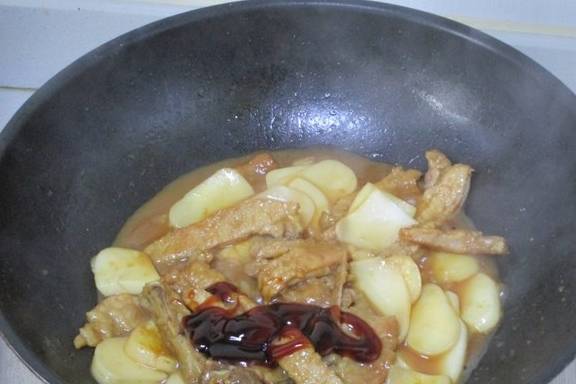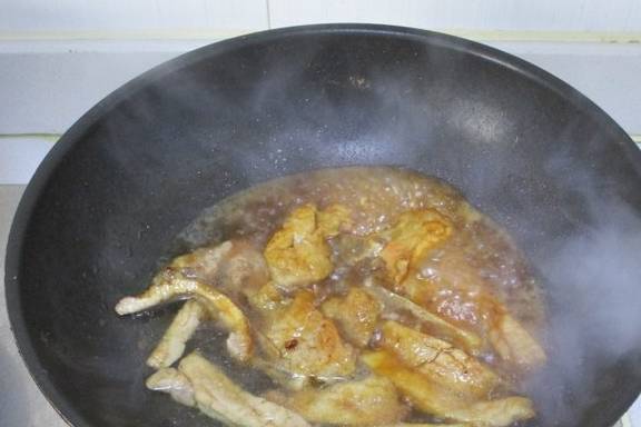倒去多余的油,下入排条,加入生抽和热水盖上大火烧开后转中小火烧制排骨熟透