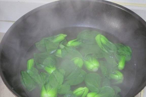 先把青菜装入盘底再把烧好的排骨年糕加上,撒上葱花即可享用
