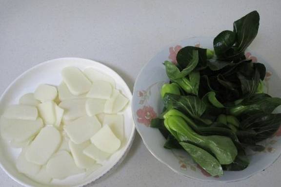 详细做法请往下看;需要的食材;大排3块年糕350克青菜100克油30毫升盐2克生抽2汤匙黄酒1汤匙葱花少许生粉1汤匙蚝油少许