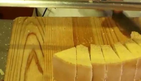 然后切成均匀的三角形,切开才看清着面包是外面焦黄,里面松软,吃上一口真的是享受,小编尝过后才明白为什么小伙的生意这么好,剧小伙说这面包不但看着稀罕而且口感味道也罕见,所以小伙卖18元一斤生意很好,每天做500斤都不够卖的!收益我想也一定很丰厚吧!23岁男子辞职后街边卖“稀罕小吃”18元一斤,每天500斤不够卖!