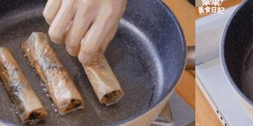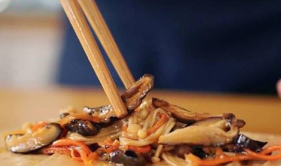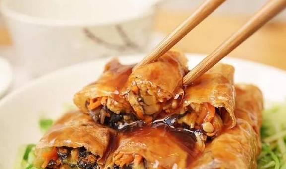 菌菇蔬菜入锅先和调味炒香,再拿豆皮卷了,微微煎香,切断,就鲜味十足了。